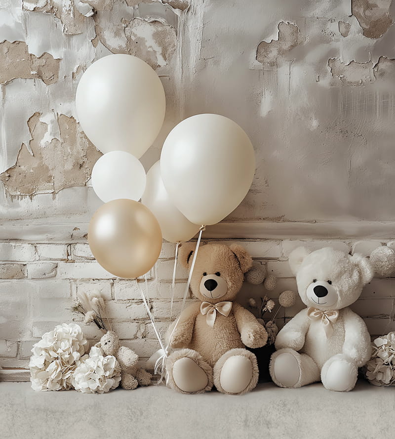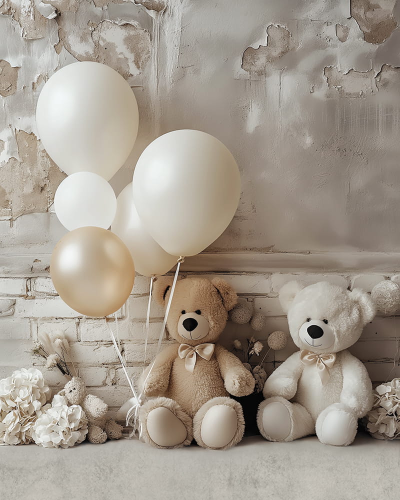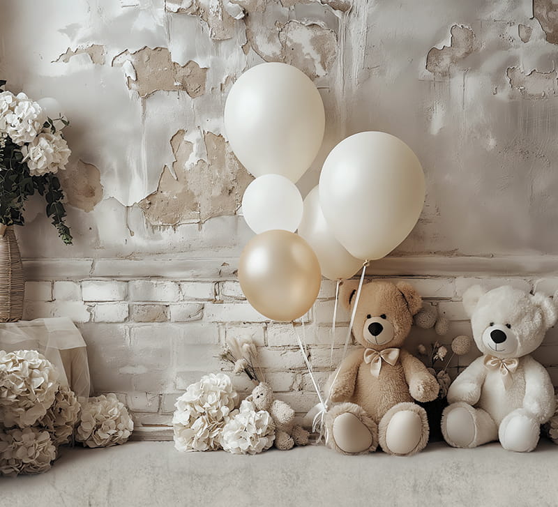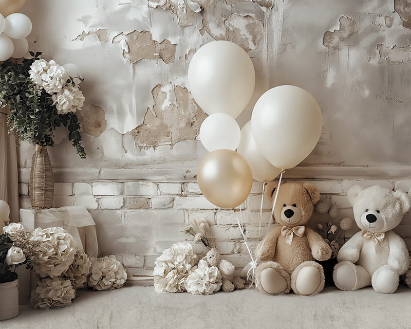 tło fotograficzne w stylu boho z misiami, wykonane na matowym winylu, lub na tkaninie, do fotografii noworodkowej, dziecięcej lub produktowej