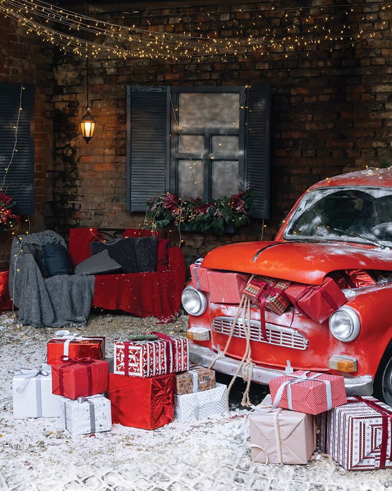 Mikołajki, czy wigilijny wieczór, zdecydowanie, kojarzą się ze śniegiem, choinką i prezentami. Jeśli chcemy, aby stały się elementem świątecznej fotografii możemy zapakować w papier ozdobny - różnej wielkości pudełka i przyozdobić je wstążkami, tworząc w ten sposób własne akcesoria fotograficzne. Możemy także stworzyć całą aranżację w śniegu, na dworze, jednak nie jest to zbytnio komfortowe, zarówno dla fotografa, jak i osoby fotografowanej, ze względu na niskie temperatury. Ostatnio dość ciekawym symbolem jest także czerwony samochód, który jest bardzo trudno osiągalnym rekwizytem. W naszej najnowszej propozycji - oferujemy projekt świątecznego tła fotograficznego z czerwonym samochodem sw195_.